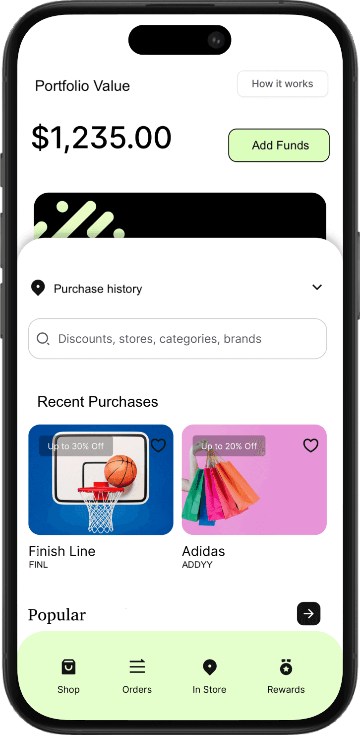 The moment you swipe, fractional shares are purchased in the brand behind it. No apps to open, no decisions to make.